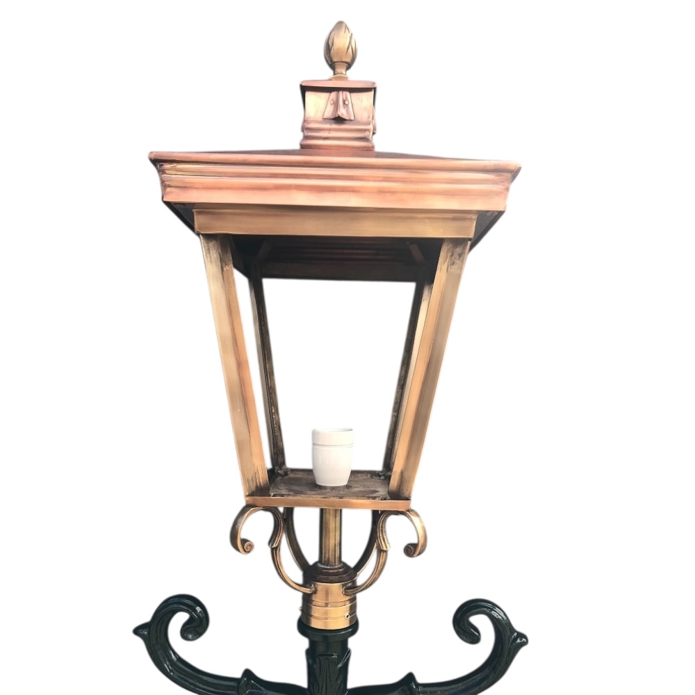 Een smaakvolle nostalgie lamp voor uw tuin, zwaar uitgevoerd met grote XL lampenkop, geheel koper-messing, zeer fraai!!.