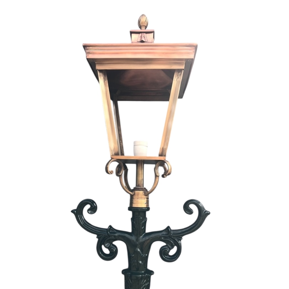 Buitenlamp, lantaarn, tuin lamp, lampen voor de tuin, paal aluminium groen of zwart met koperen XL vierkante kap met glas en fitting, hoogte 250 cm