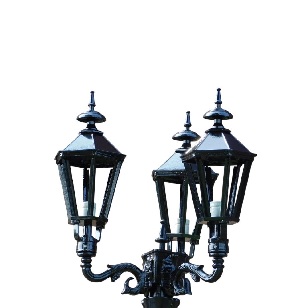 Buitenlamp , Amsterdam lantaarn, tuin lamp , lampen voor de tuin , aluminium zwart of groen, hoogte 320 cm Een smaakvolle nostalgie lamp voor uw tuin, zwaar uitgevoerd met grote lampenkop, geheel aluminium, zeer fraai!! . Een buitenlamp met veel charme , die de oorspronkelijke histo...