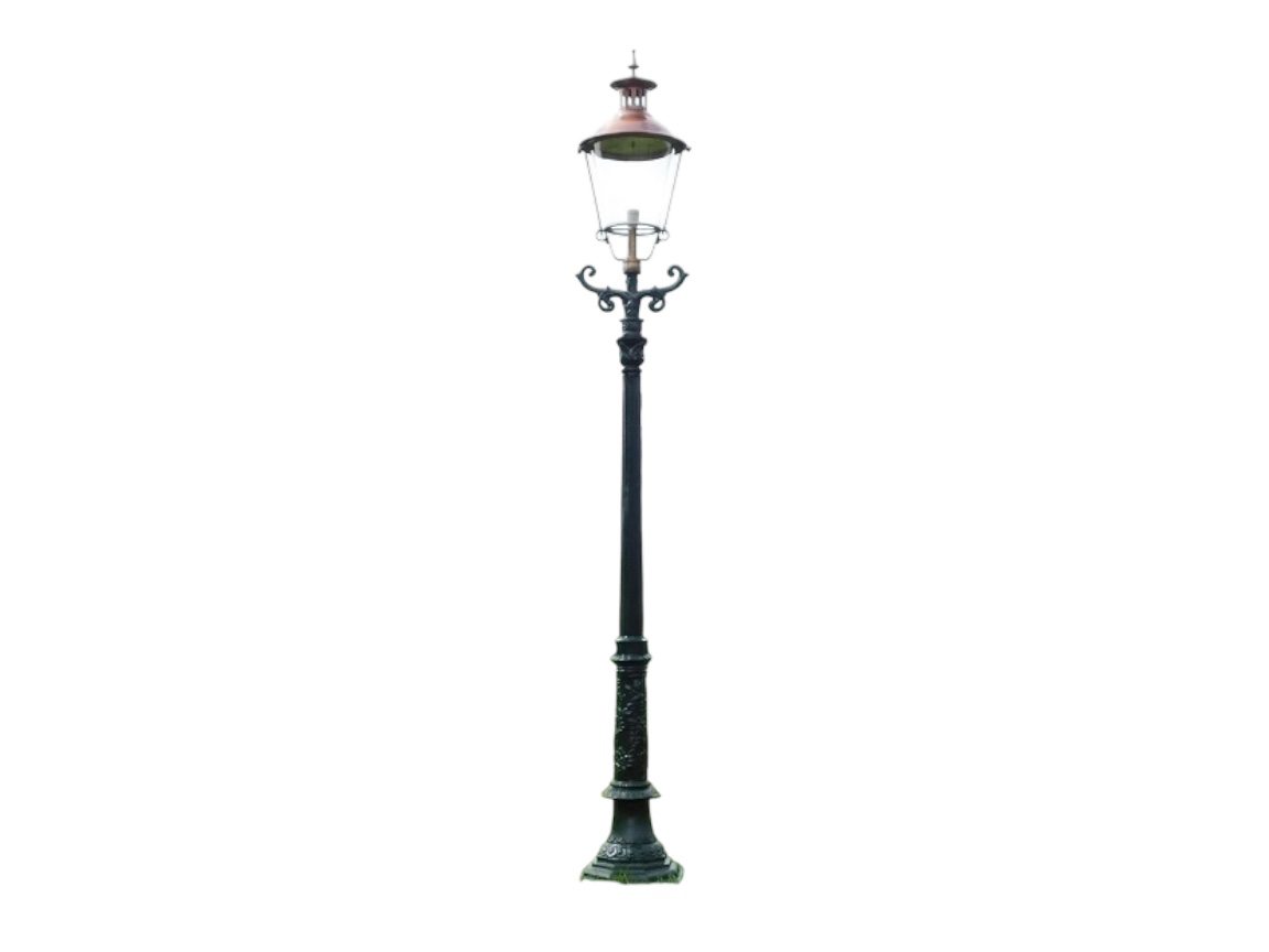 Leveringsomvang: tuinlantaarn, gietijzeren paal, messing en koperen kap, keramische fitting.